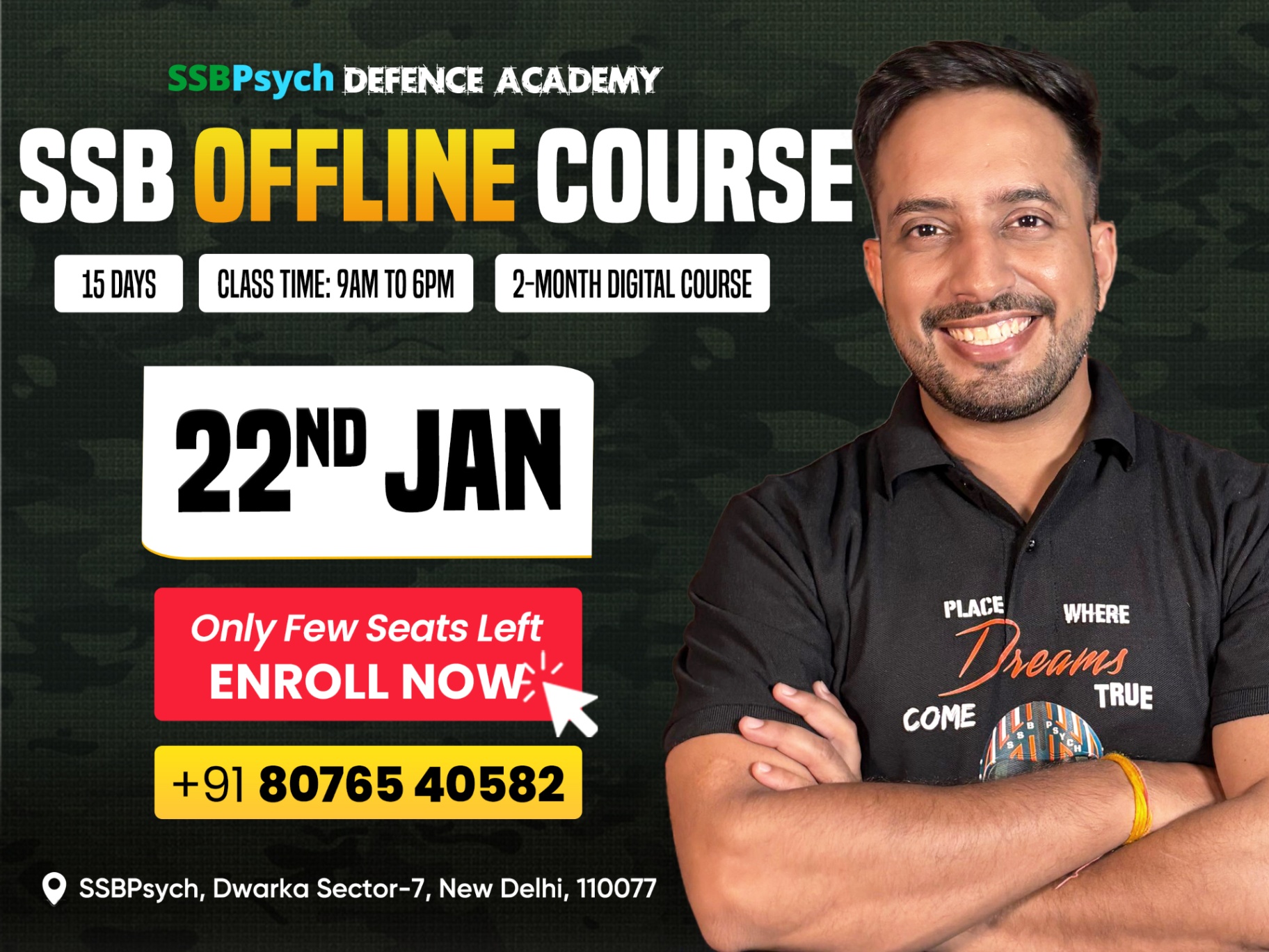 SSBPsych Offline Batch : 22nd January 2026📌 🏁Course Start Date: 22nd January 2026 📌Location: SSBPsych , Sector 7, Dwarka New Delhi 📍Duration: 15 days 📍Timings: 9:00 AM - 2:00PM ⏰ 3:00 pm- 6:00 pm( Mock interview & Assessment Session) 📍Batch Size: 30 students (personalized attention) ◾Payment Options: 👉 Course fees: Rs 19,999 👉Registration Amount: Rs 999 (Remaining amount (Rs. 18,999 to be paid at the academy) ◾Accommodation: 👉Fee: Rs 6,000 (Includes three meals and basic facilities) ✨ Why Join This Batch❓❓ ◾This course will cover everything thoroughly, including Psychology, GTO, and Interview preparation. ◾Get multiple solutions for GTO tasks and do prepare on India's Best GTO ground with SSBPsych ◾Weekend PPDT practice sessions. ◾Individual guidance and one-to-one interaction for concept clarity and doubt resolution in interviews and psychology. ◾Register now◾